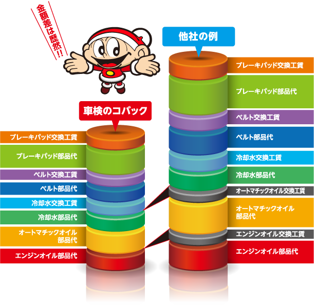コバックの「車検基本料」には、点検料・検査料・申請代行料等は全て含まれております。消費税は含まれておりません。